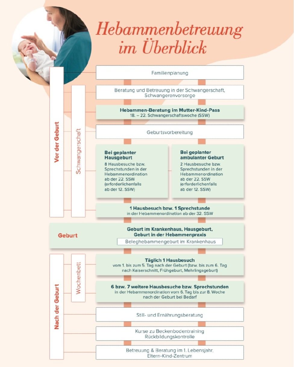 Folgende Grafik erklärt, welche meiner Leistungen von der Krankenkasse übernommen werden. Die grüne Kästchen enthalten Hebammen-Leistungen in der Schwangerschaft und nach der Geburt, deren Kosten von der Sozialversicherung übernommen werden. Ich bin Hebamme mit Kassenvertrag und verrechne die Leistungen direkt mit der Krankenkasse. Jede Leistung die darüber hinausgeht wird separat in Rechnung gestellt.
